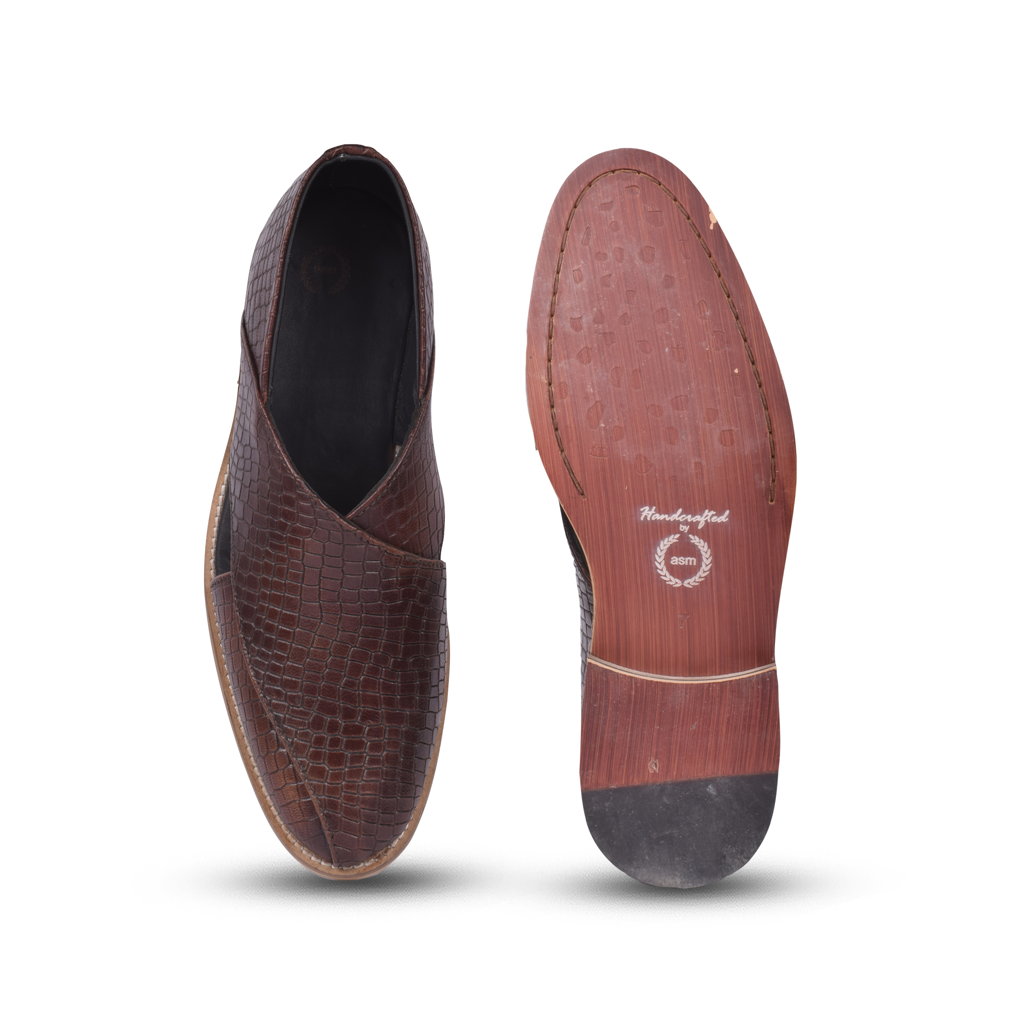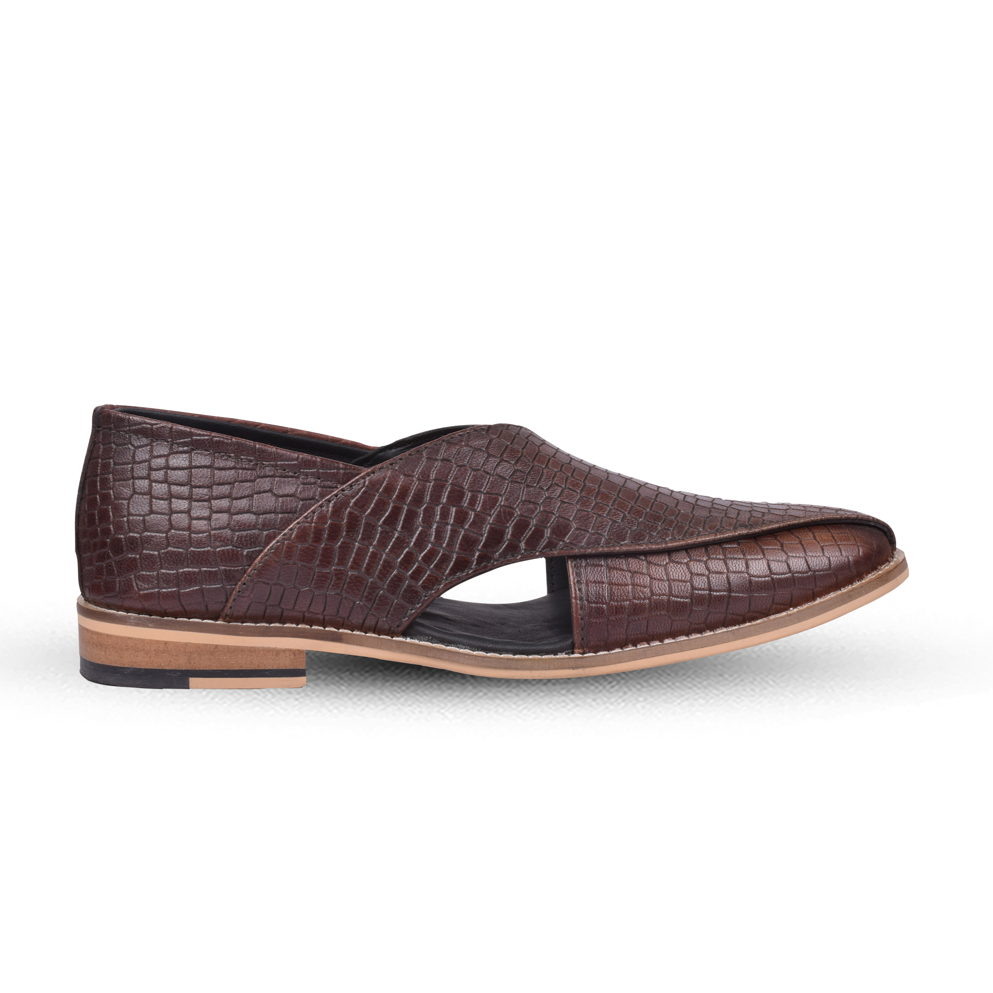Peshawari Leather Sandals, Imported Alligator Print Leather upper, Softy Leather Lining with Memory Foam footpad for optimum comfort. Peshawari12-Alligator-Brown