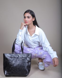 Tote Leather Bag : BLACK FOLIAGE EMBOSSED LEATHER TOTE BAG